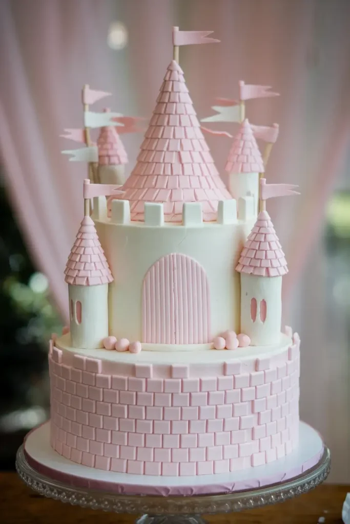 This cake feels like it came straight out of a fairy tale. The pink and white color palette is soft and magical, and those piped buttercream bricks are such a thoughtful detail. While this design does take a bit more time and effort, the end result is completely worth it.