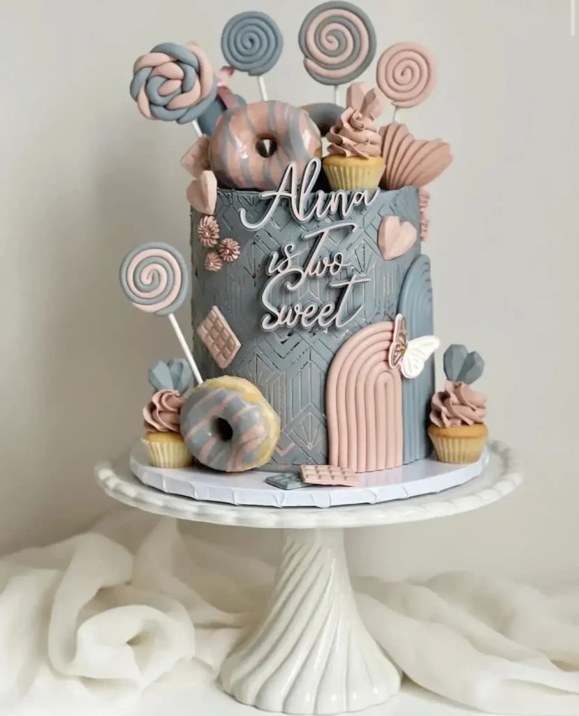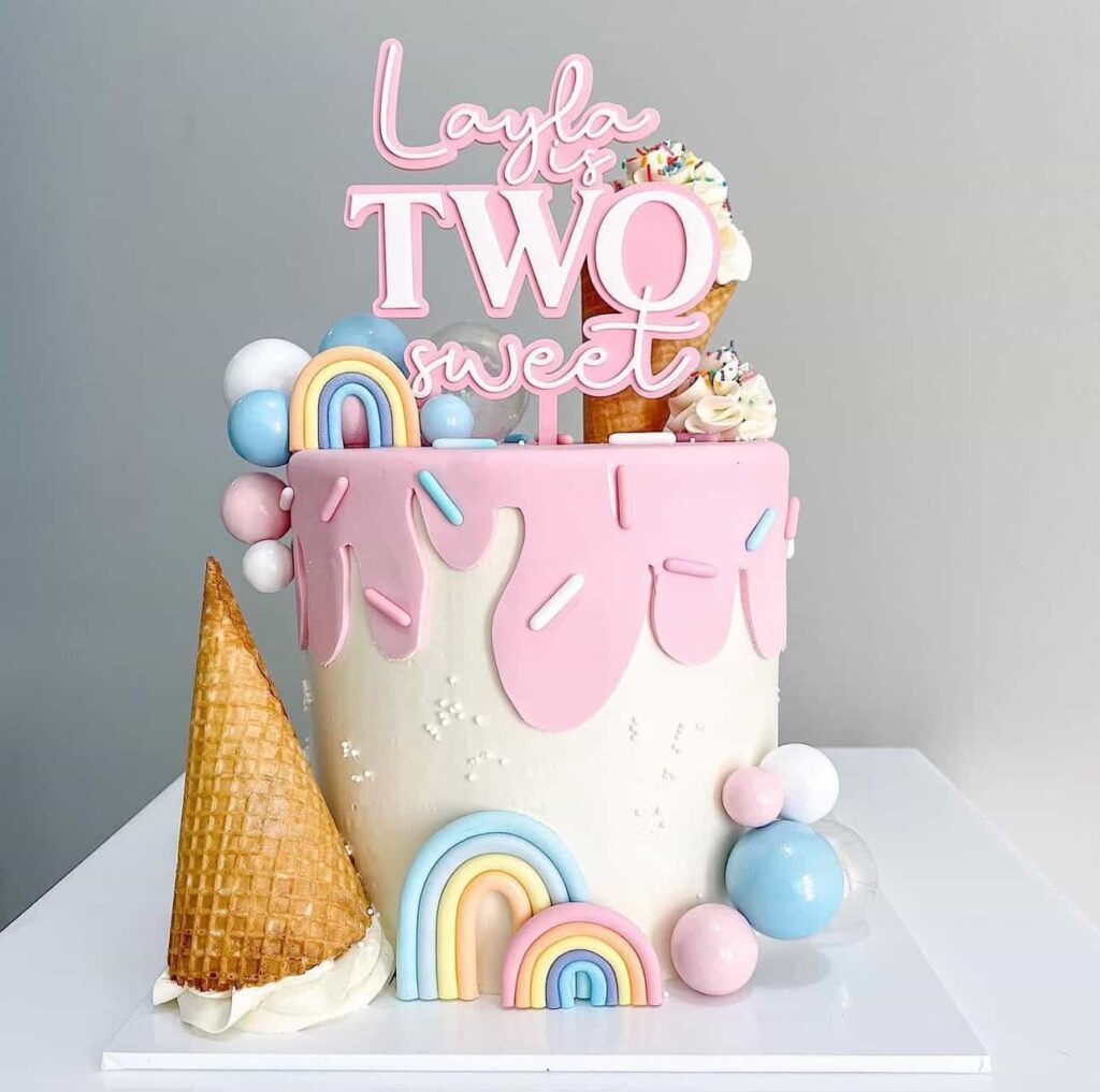 The pastel color combination works perfectly for this style and keeps everything soft and cohesive. It is finished with a custom topper that reads Layla is Two Sweet, created by Steff Creates.