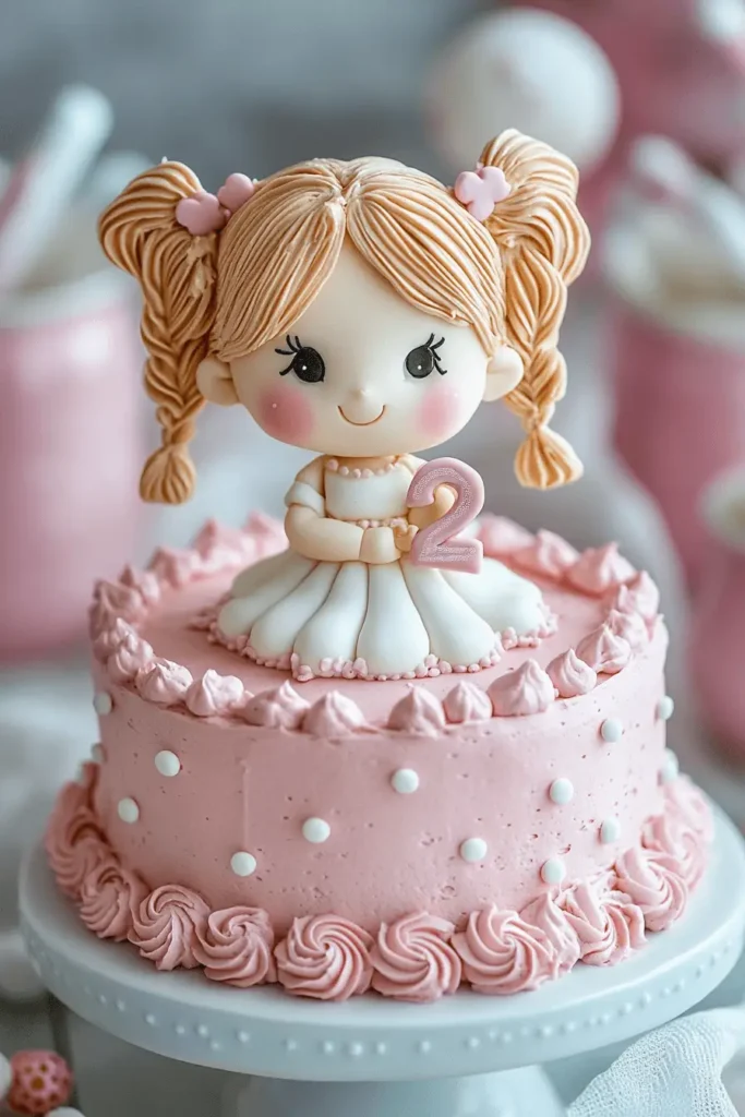 A pastel-themed cake topped with an adorable fondant baby girl holding a tiny number 2 sign. The cake is decorated with soft polka dots and finished with a ruffled buttercream border for a playful look. This cake is seriously heart-melting.