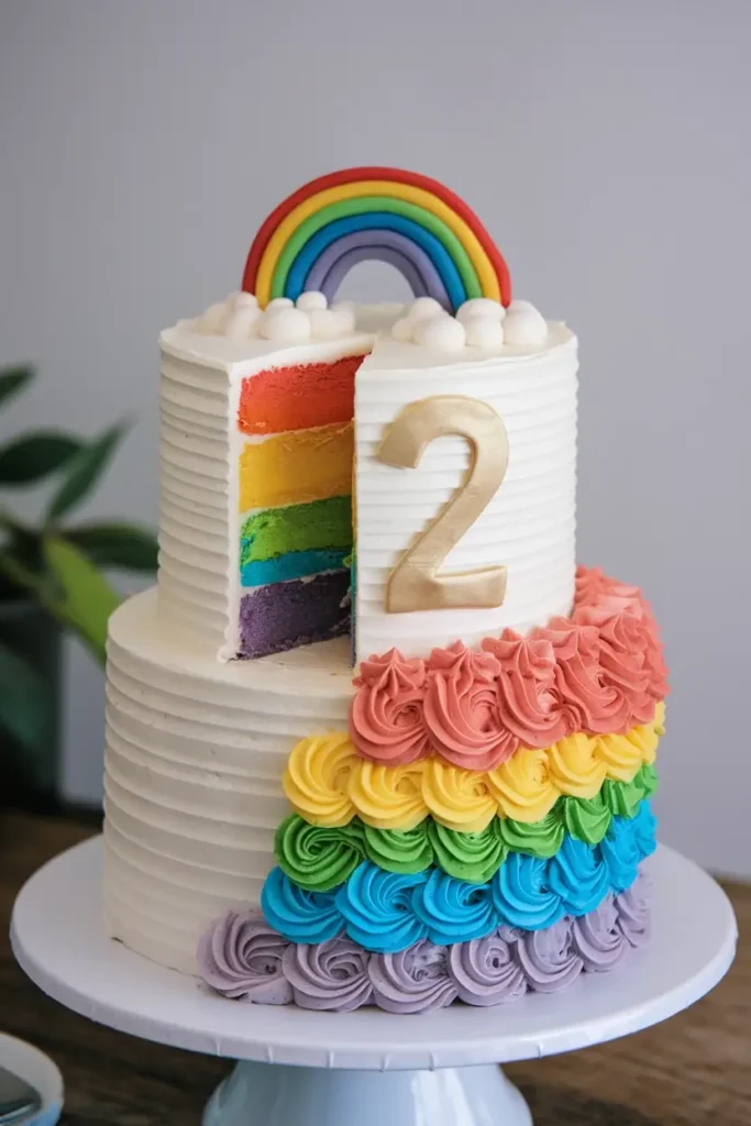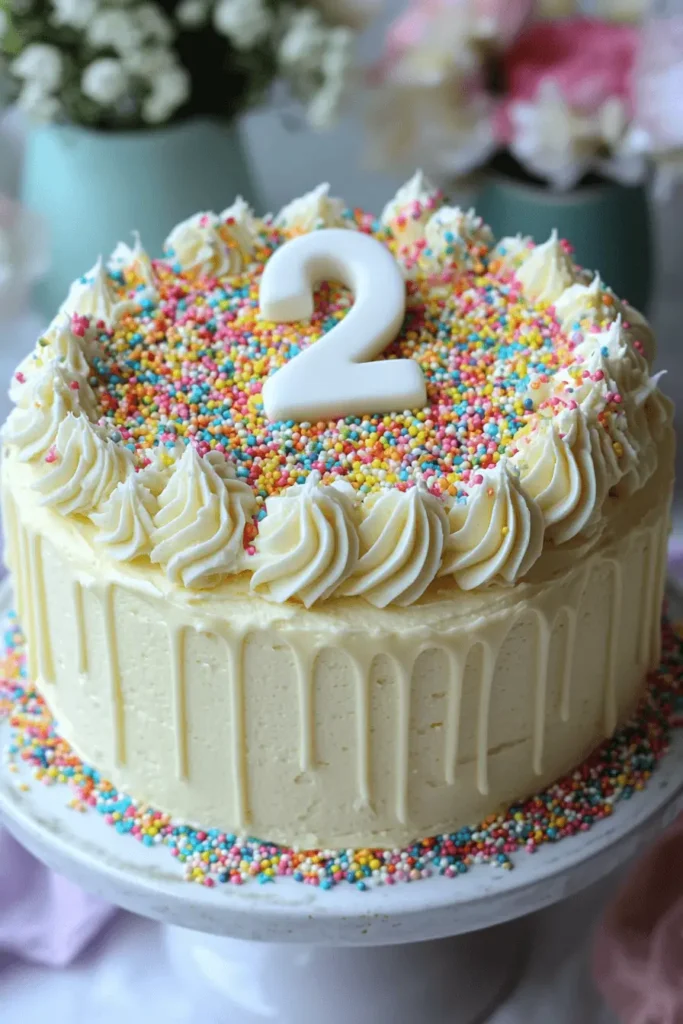The number 2 placed in the center stands out beautifully against all that color and keeps the focus on the milestone. This cake feels classic, cheerful, and easy to customize with your child’s favorite colors. The sprinkle finish makes every slice feel festive and fun, making it a great choice for a low-stress but joyful celebration.