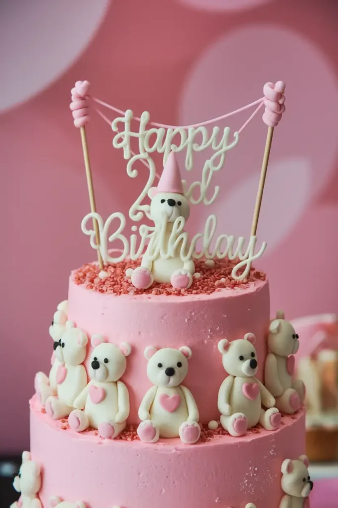 A pink buttercream cake decorated with small white fondant teddy bears wrapped around the sides creates such a sweet and playful look. Each bear holding a tiny pink heart adds even more charm, while the larger teddy bear topper wearing a party hat really steals the show.