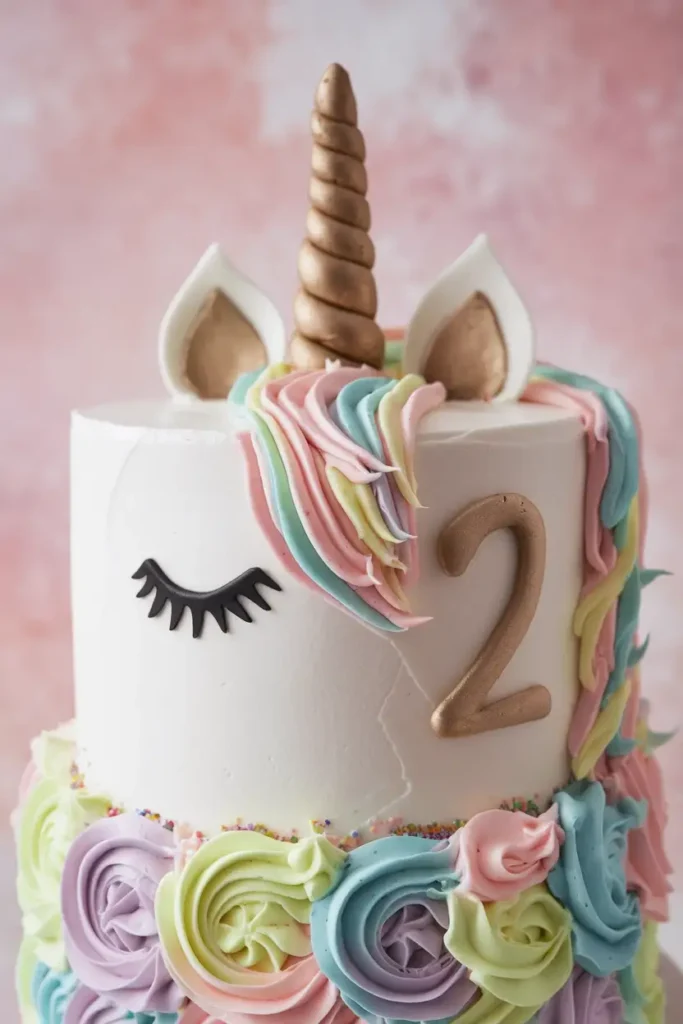 Colorful buttercream rosettes in pastel shades decorate the base and add so much texture and fun. The mix of unicorn charm and birthday details makes this cake feel thoughtful and festive. It is a beautiful option for a unicorn-themed party or any little girl who loves all things magical.