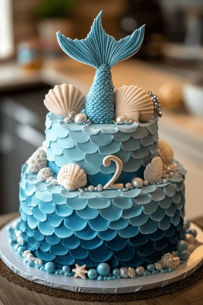 The mermaid tail diving into the cake is such a clever idea and makes it feel like the birthday girl is part of the underwater magic. A little edible glitter brings everything to life and adds sparkle. This cake is a wonderful choice for a mermaid-loving two-year-old and feels both playful and imaginative.