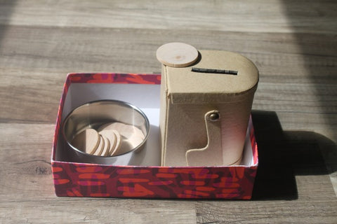 Materials Needed: Shoe box or small box with a lid, colorful papers or coins, scissors, and markers or colored pencils