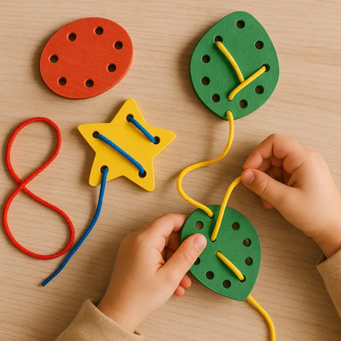 Give your child a shoelace or string and show them how to thread it through the holes. This simple motion helps develop coordination and patience. Once your child gets the hang of it, try introducing color or pattern challenges, such as threading in a specific order.