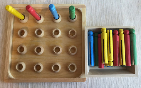 Materials Needed: A clean soup container or small box with a lid, and pegs like those from a hammering set, clothespins, or wooden sticks