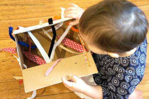 Thread ribbon scraps through the holes and tie knots at each end so they can’t pull all the way out. Toddlers love tugging the ribbons and watching them move in and out, a perfect activity for curious little hands.
