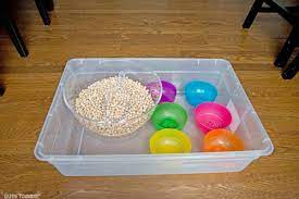 Materials Needed: Empty container such as a plastic bin or cardboard box, and plastic eggs or other small items