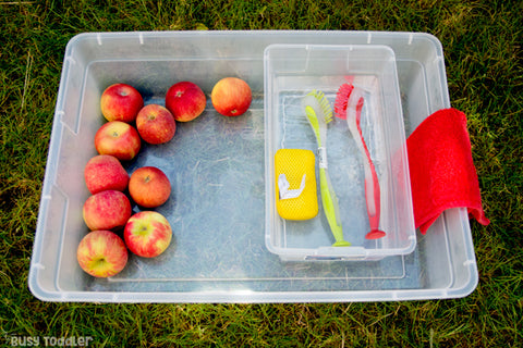 This Montessori activity combines fun with practical life skills. Place a few apples in a large bin and fill a smaller container with water.