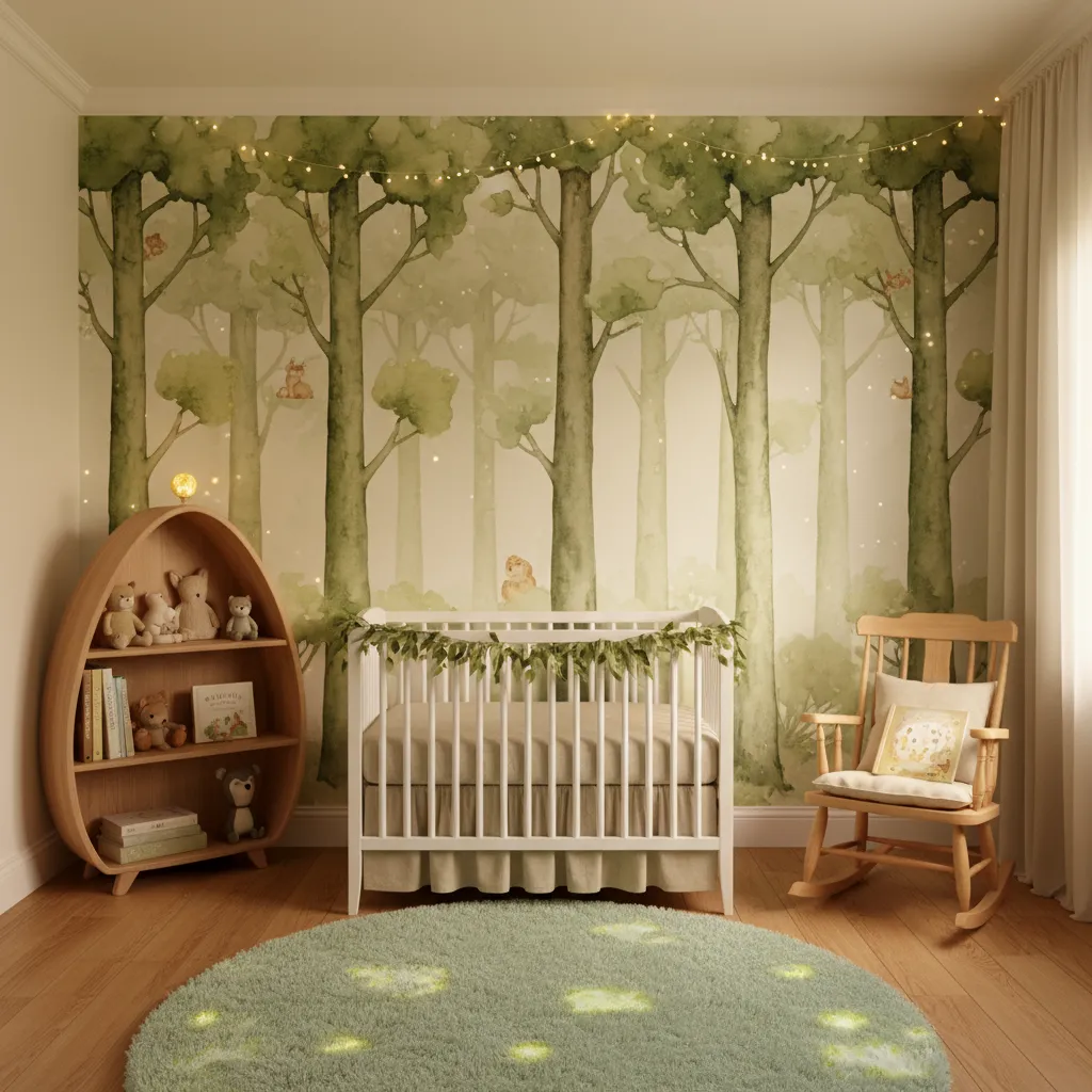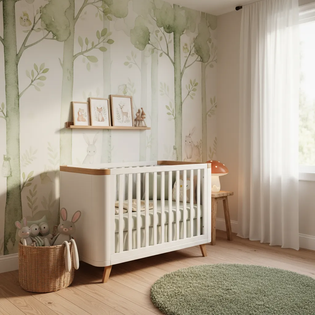 Adding woodland animals brings a gentle fairytale charm into the room. Soft toys shaped like foxes, owls, or rabbits can be placed on shelves or in baskets. Wall stickers of tiny creatures wandering through a forest also work well. These little touches make the nursery feel like part of an enchanted story.