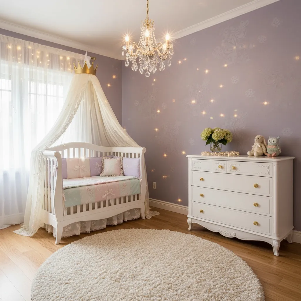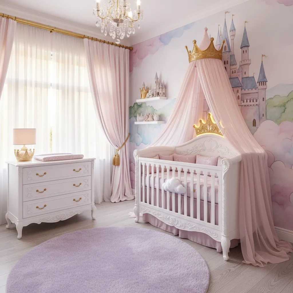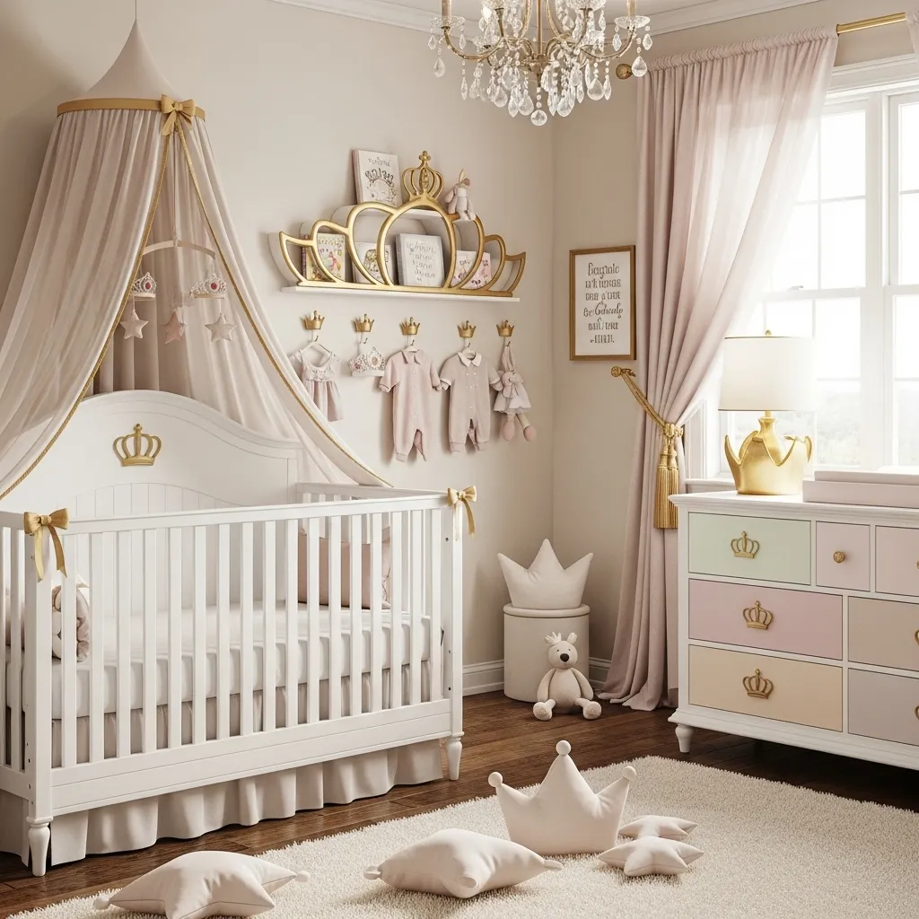 Small crown details can add a final touch of magic. Hooks shaped like crowns, tiara wall shelves, or even a crib accent can fit this idea. These details are subtle but make the room look special. It is a simple way to give the nursery a royal fairytale finish.
