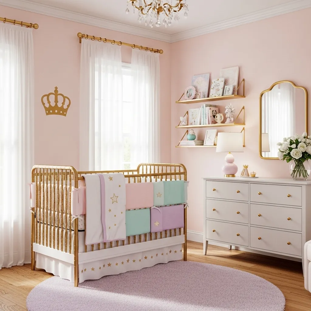 Colors set the tone for the whole nursery. A mix of soft pastels with golden accents creates a royal and gentle look. Think blush pink walls with golden shelves, or mint green paired with gold curtain rods. This color combination feels timeless and gives the space a warm glow.