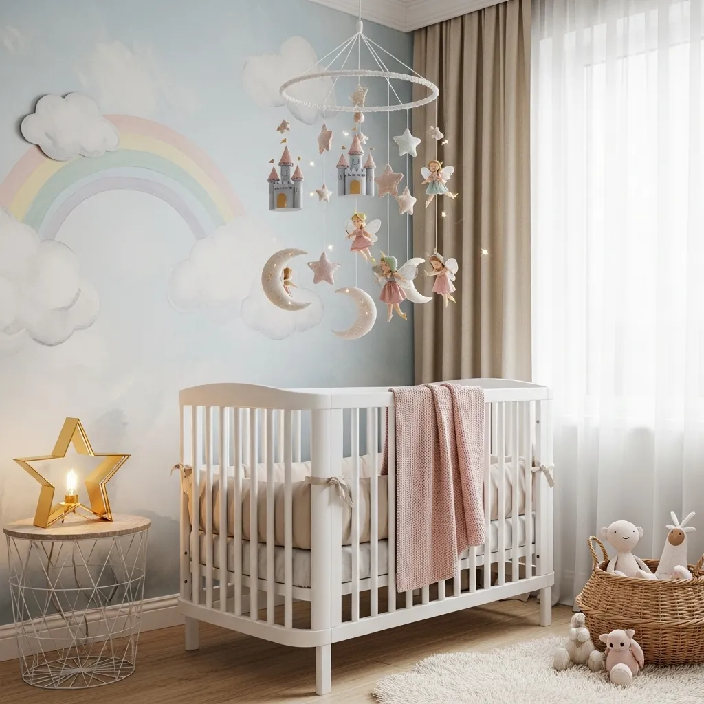 A mobile above the crib can easily carry the fairytale theme. You can make one with tiny castles, stars, and little fairies hanging on threads. Materials like felt, paper, or wood work well for a handmade look. Watching it sway gently will be soothing for your baby while adding charm to the room.