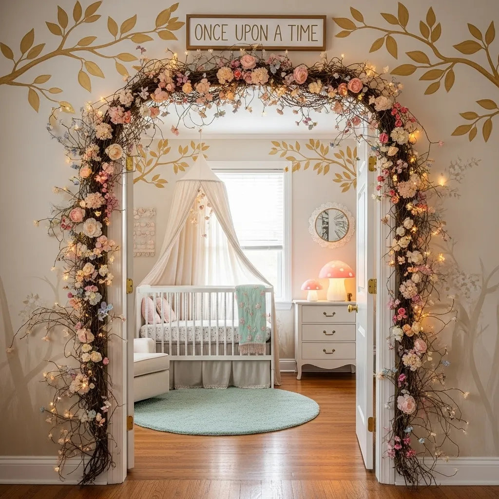 The nursery entrance can be designed to feel like stepping into another world. Adding an arch-shaped frame or artificial vines around the door creates that effect. It sets the mood even before you walk in. Parents and guests will instantly feel the fairytale vibe as they enter.