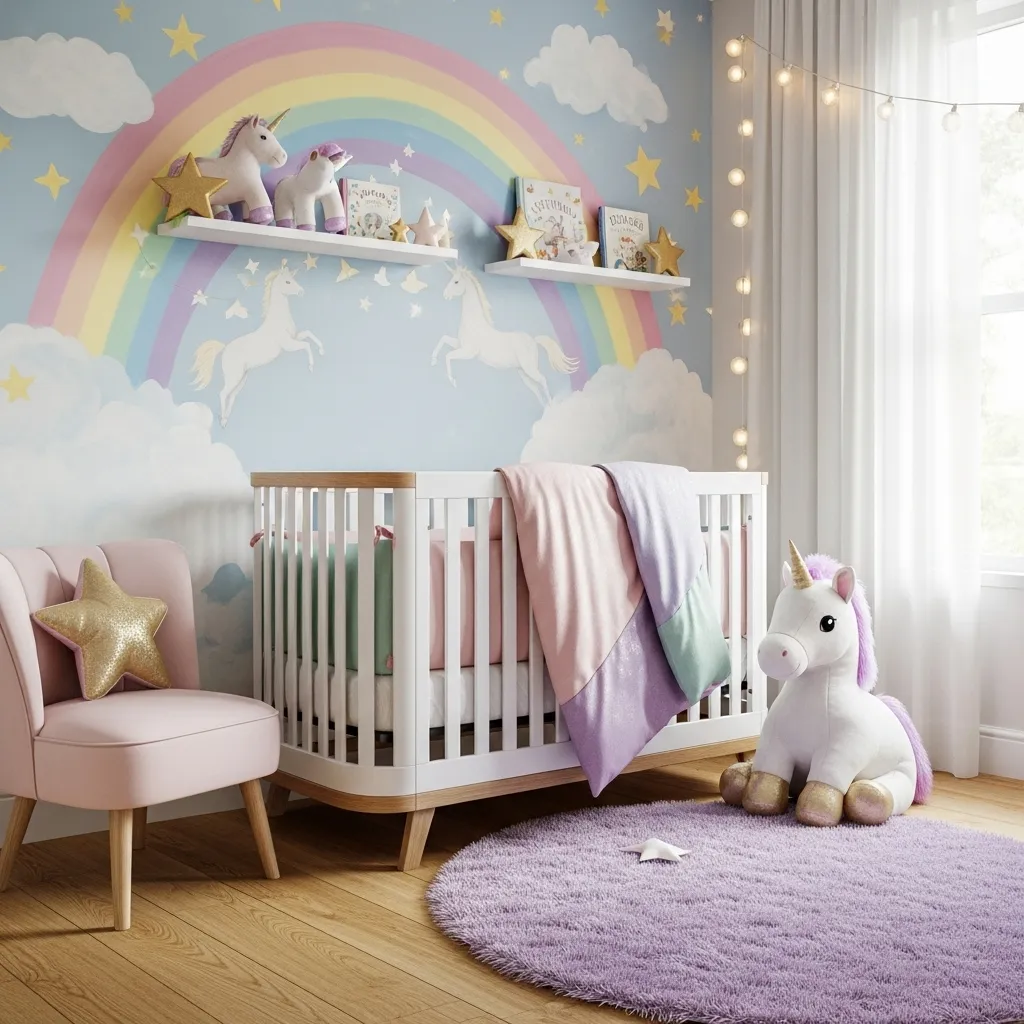 Unicorns are a classic symbol of magic and wonder. Adding a unicorn plush toy, a wall decal, or even a small rug with unicorn patterns can brighten the nursery. Soft pastel rainbows paired with unicorn details give the space a dreamy atmosphere. It is playful, gentle, and perfect for a fairytale setting.