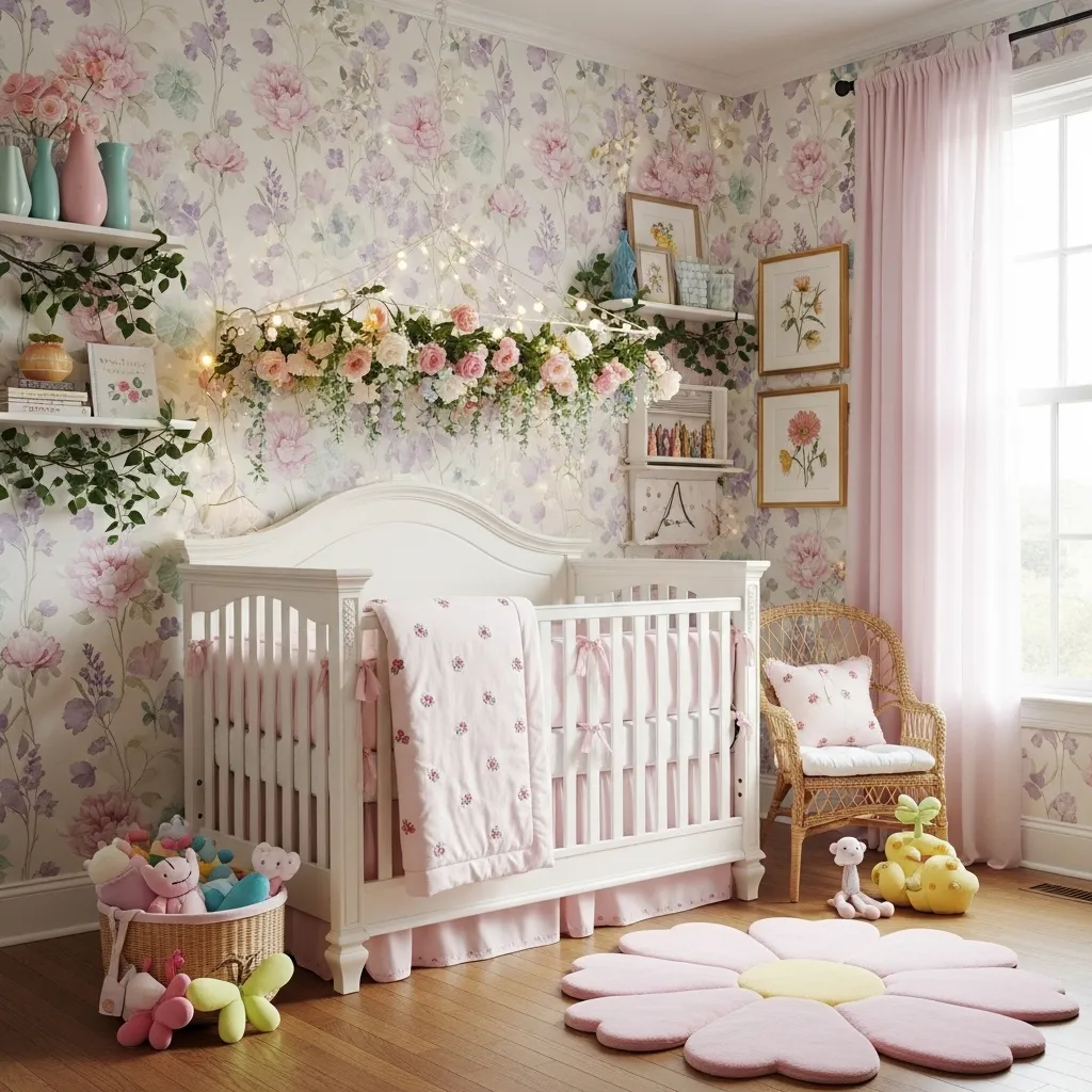 Transform part of the nursery into a little indoor garden. Floral wallpaper, artificial vines, or even hanging flower garlands make the room bloom. A soft rug shaped like a flower can complete the look. This theme works beautifully if you want the space to feel lively and fresh.