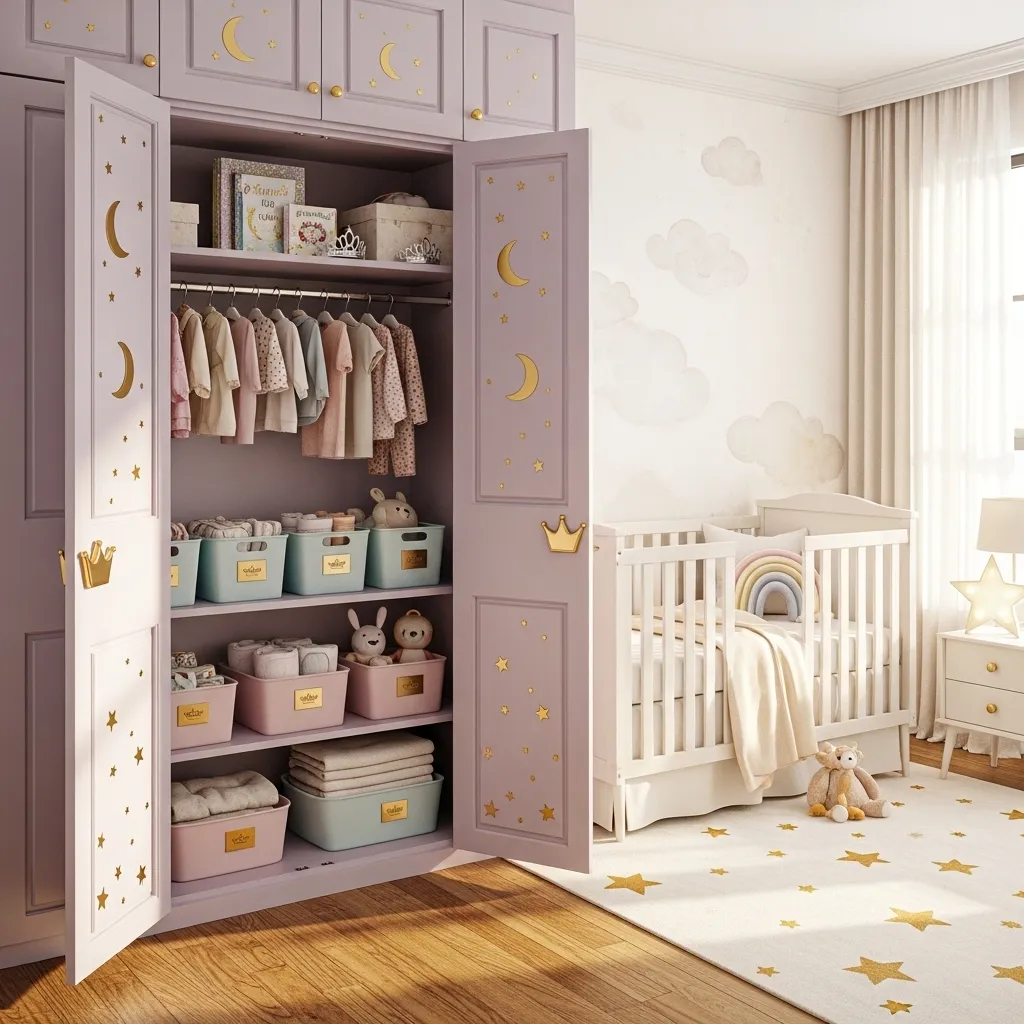 Even a simple closet can join the fairytale story. Painting the closet doors with pastel colors or adding decals of stars and moons makes it stand out. Inside, small golden baskets or fabric bins can keep baby clothes neatly arranged. This detail adds charm while keeping the space functional.