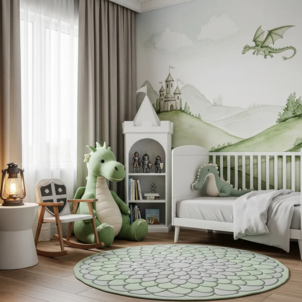 For parents who want a more adventurous touch, a dragon-themed corner is a fun idea. A plush dragon, knight figurines, or a small castle shelf can create a magical nook. It works especially well in nurseries designed for boys, though it can be adapted for anyone. The mix of adventure and fantasy makes the room exciting.