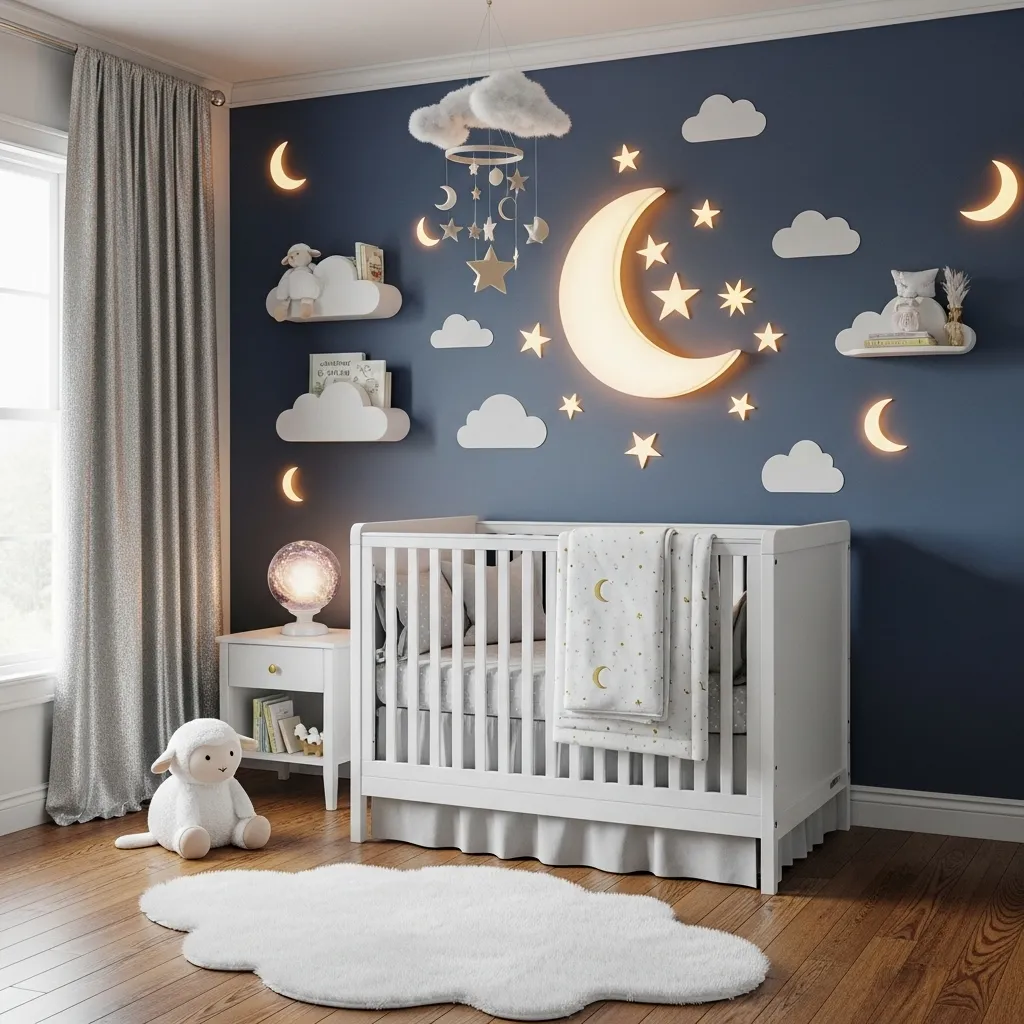 Soft clouds and glowing moons give the nursery a calm, storybook feel. You can use a cloud-shaped shelf, a moon night light, or a ceiling mobile with stars. At night, this setup feels soothing and magical. It makes bedtime easier and adds a peaceful fairytale mood to the space.
