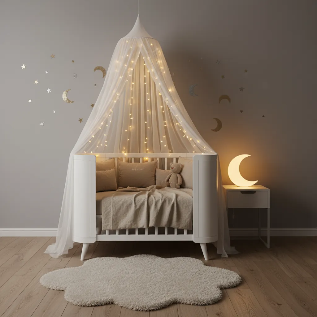 Fairy lights are simple but bring so much charm. Place a light canopy above the crib and weave warm fairy lights through it. At night, it creates a calming glow that feels like a bedtime story come to life. This idea is also budget-friendly and easy to set up.
