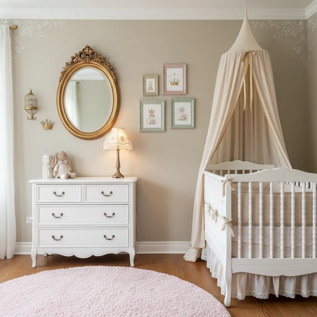 A few vintage pieces can give the nursery a unique fairytale touch. Think of a gold-framed mirror, old-style picture frames, or even painted thrift finds. These details add character and charm without making the space look too busy. They also make the room feel like it has its own little history.