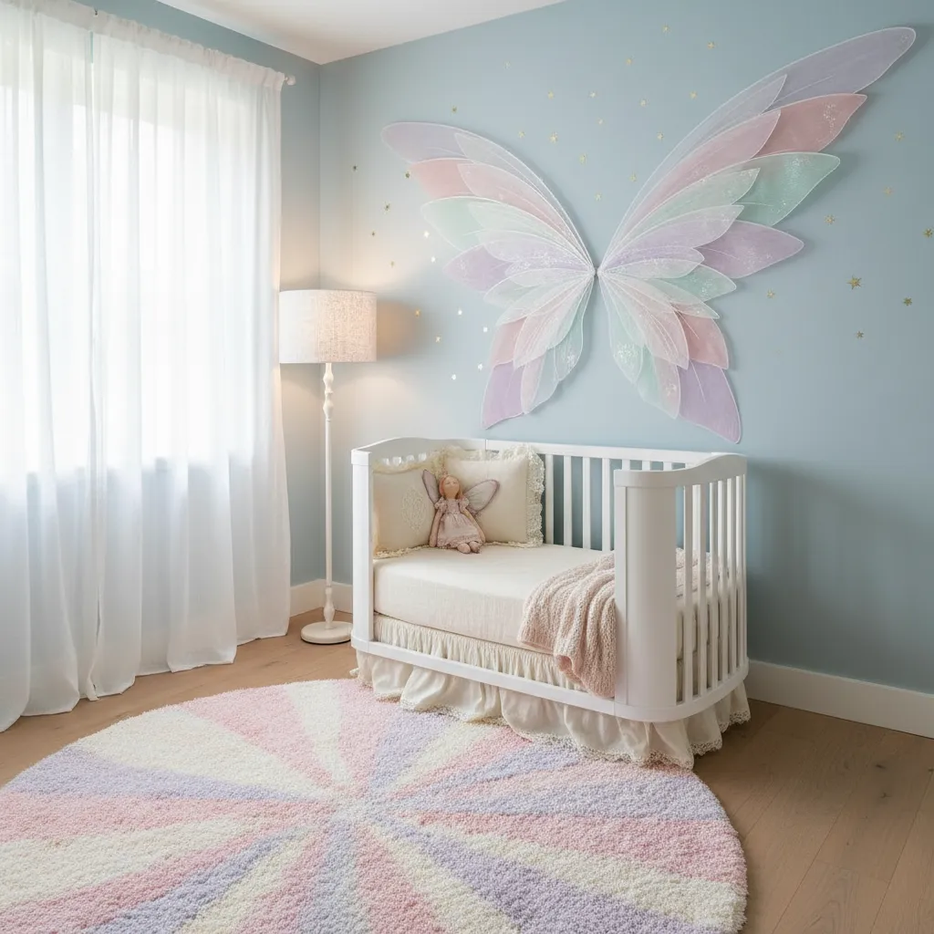 Fairy wings on the wall create a playful and magical focal point. You can find ready-made wall decals or even create your own DIY wings with fabric and a lightweight frame. Placing them above the crib or on a feature wall makes the room feel dreamy. It is a simple idea that stands out and adds personality.