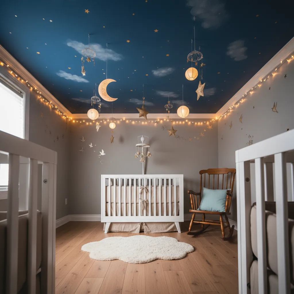 The ceiling is often forgotten in nursery design, but it can add a big impact. Glow-in-the-dark stars, painted clouds, or hanging paper lanterns shaped like moons can make bedtime special. When your baby looks up, they will see a little piece of magic above them. This idea is both fun and soothing.