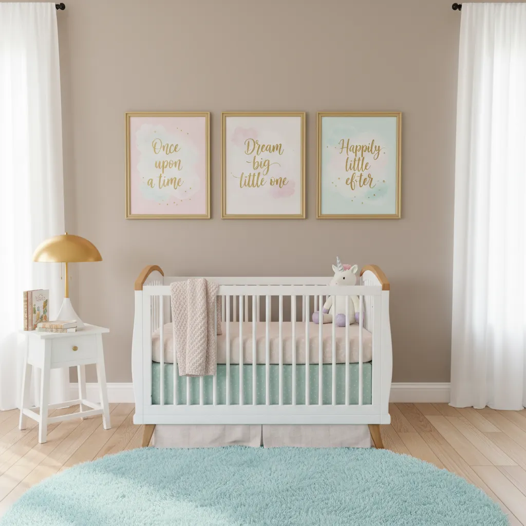 Words have a way of filling a space with warmth. Framing short quotes like “Once upon a time” or “Dream big little one” adds meaning to the nursery. You can choose elegant frames in gold, silver, or soft pastel colors. Hanging a few around the room ties the theme together in a simple but powerful way.
