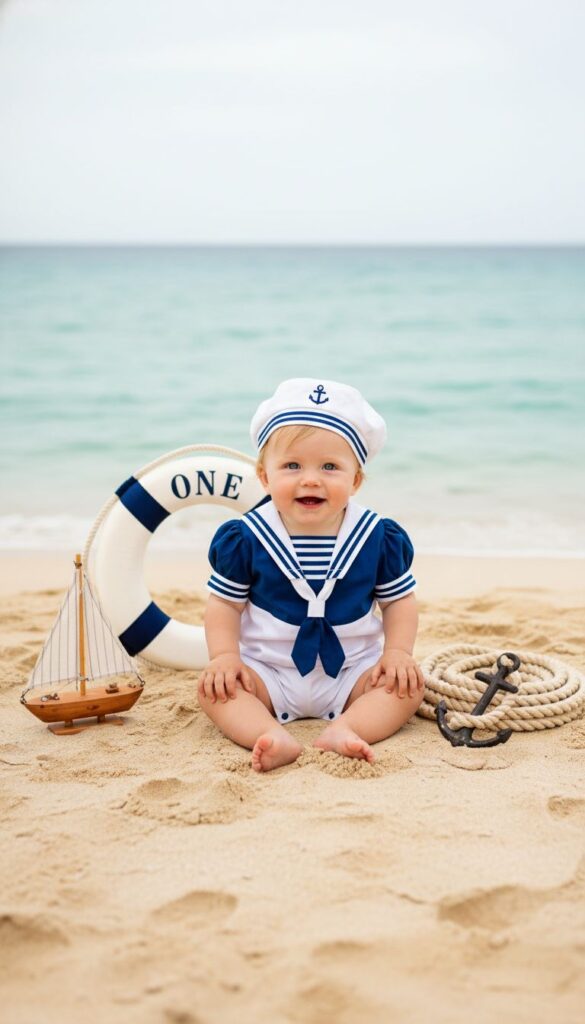 Dress your baby in a cute sailor outfit or a blue-and-white combo. Add small props like a toy sailboat or anchor to complete the look.