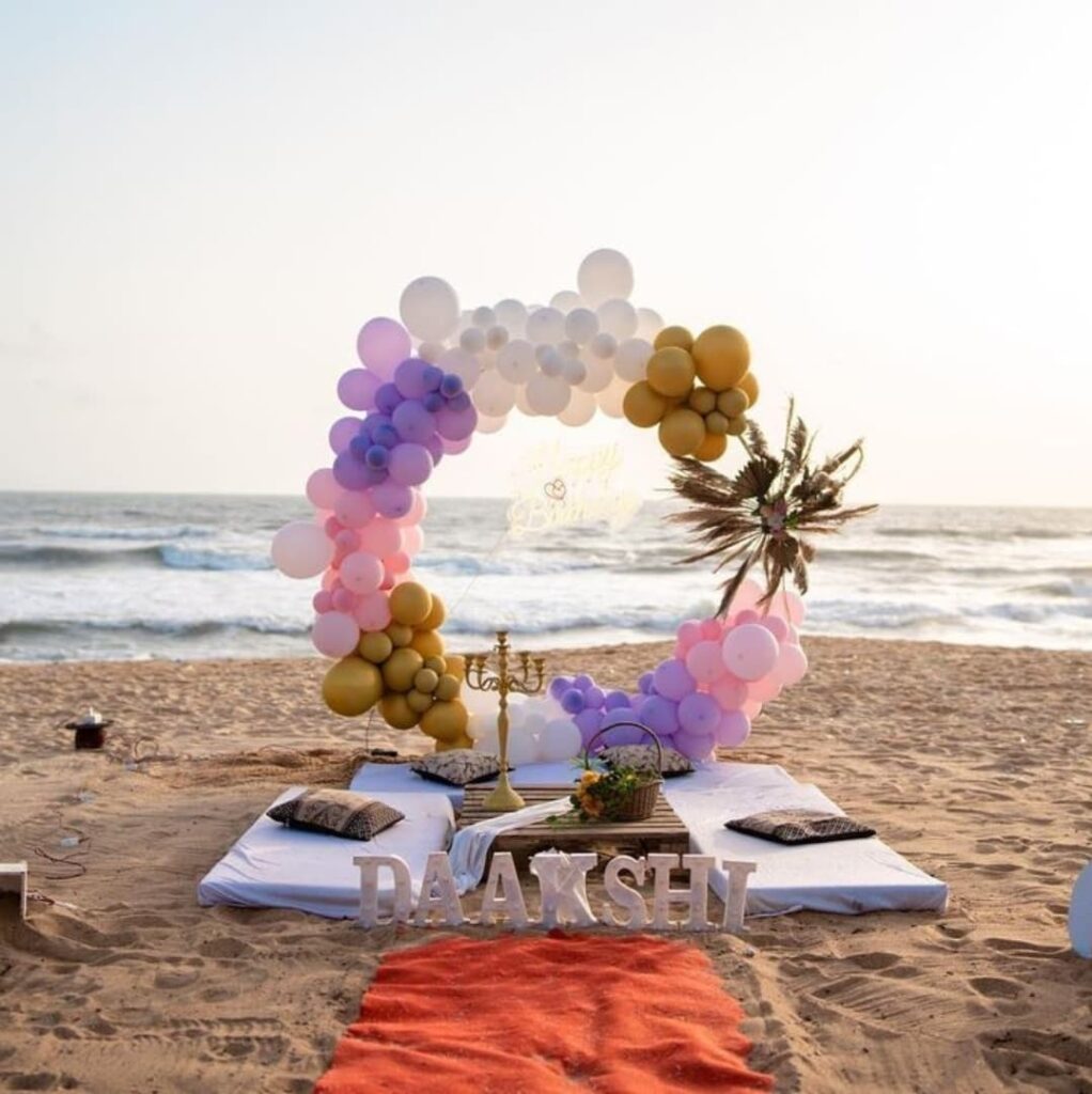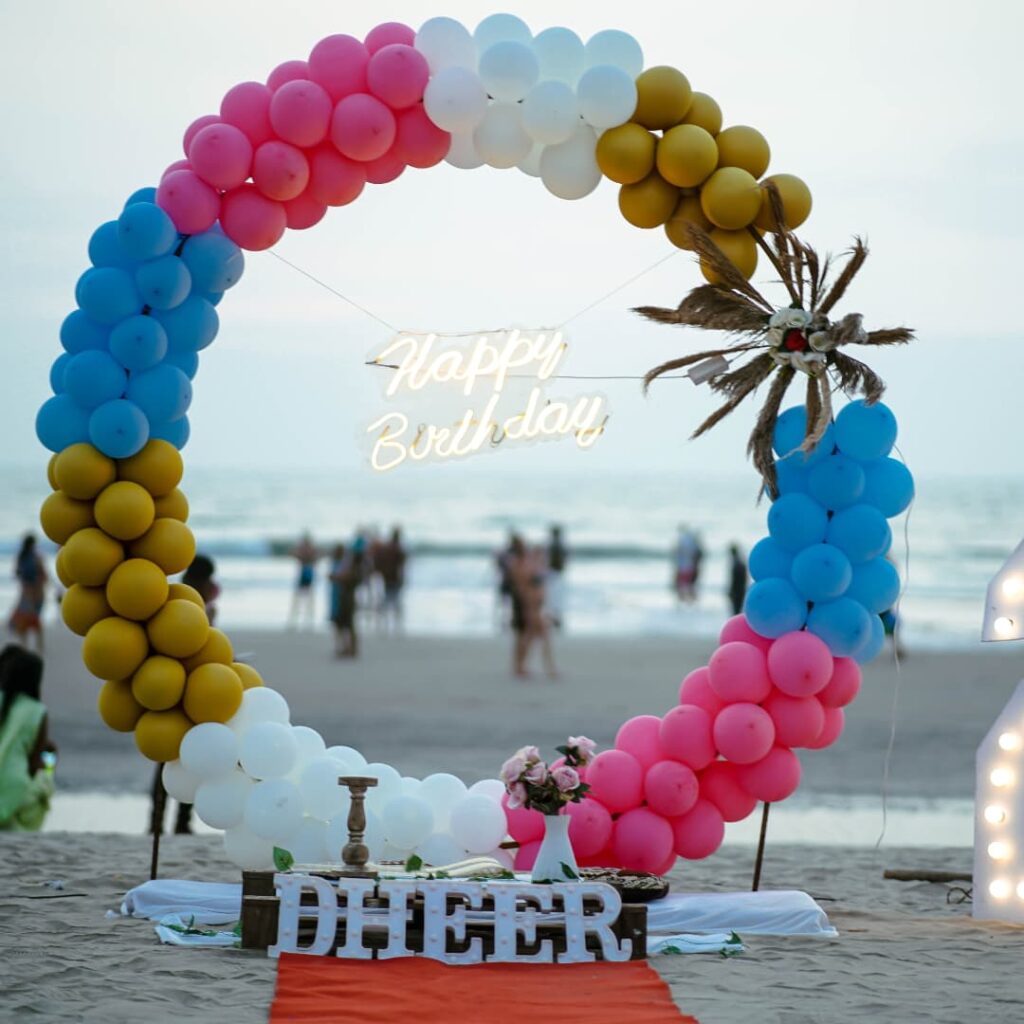This setup shines beautifully against the soft evening sky. The cool tones of blue and gold balloons blend perfectly with the calm sea, while the glowing “Happy Birthday” sign adds a cozy touch.