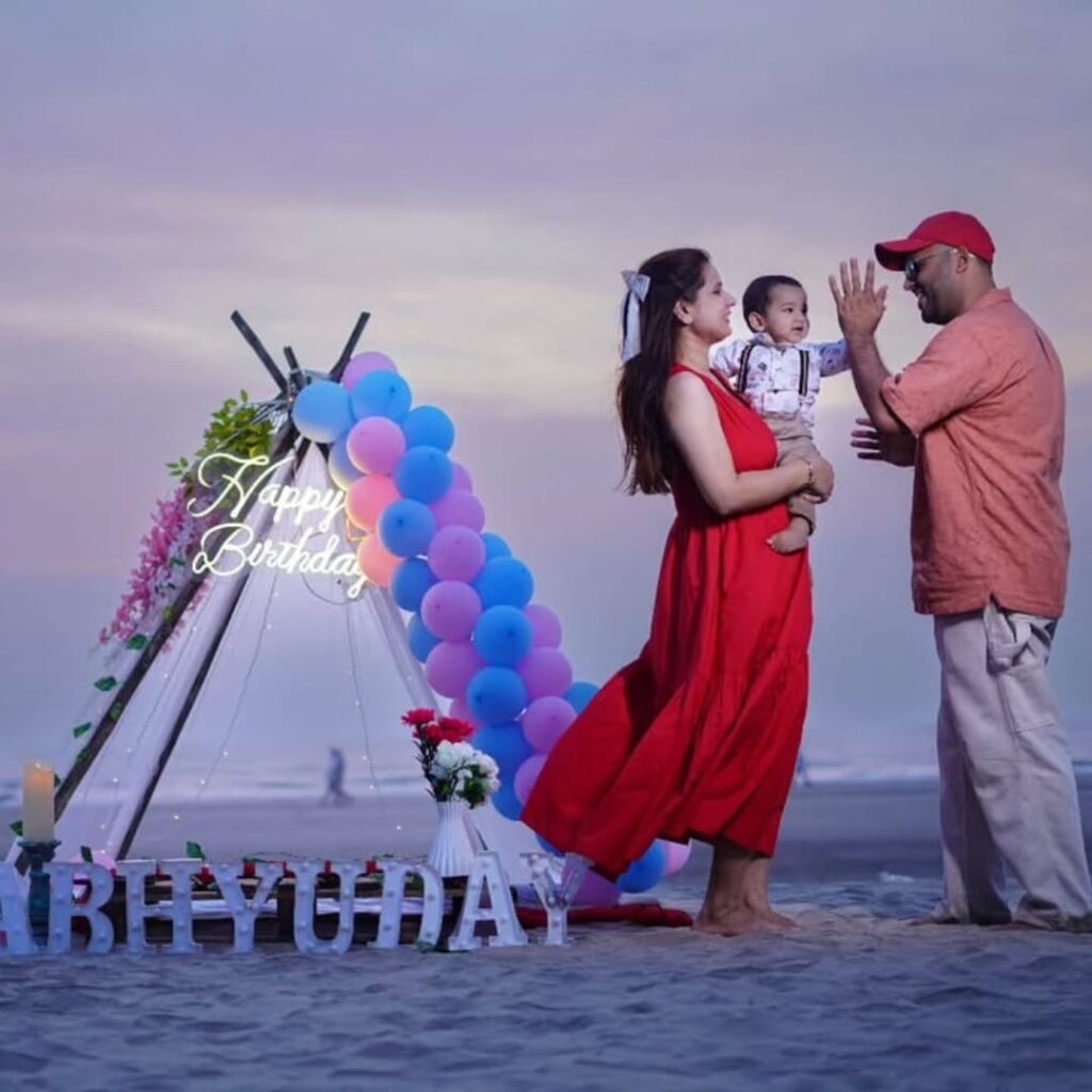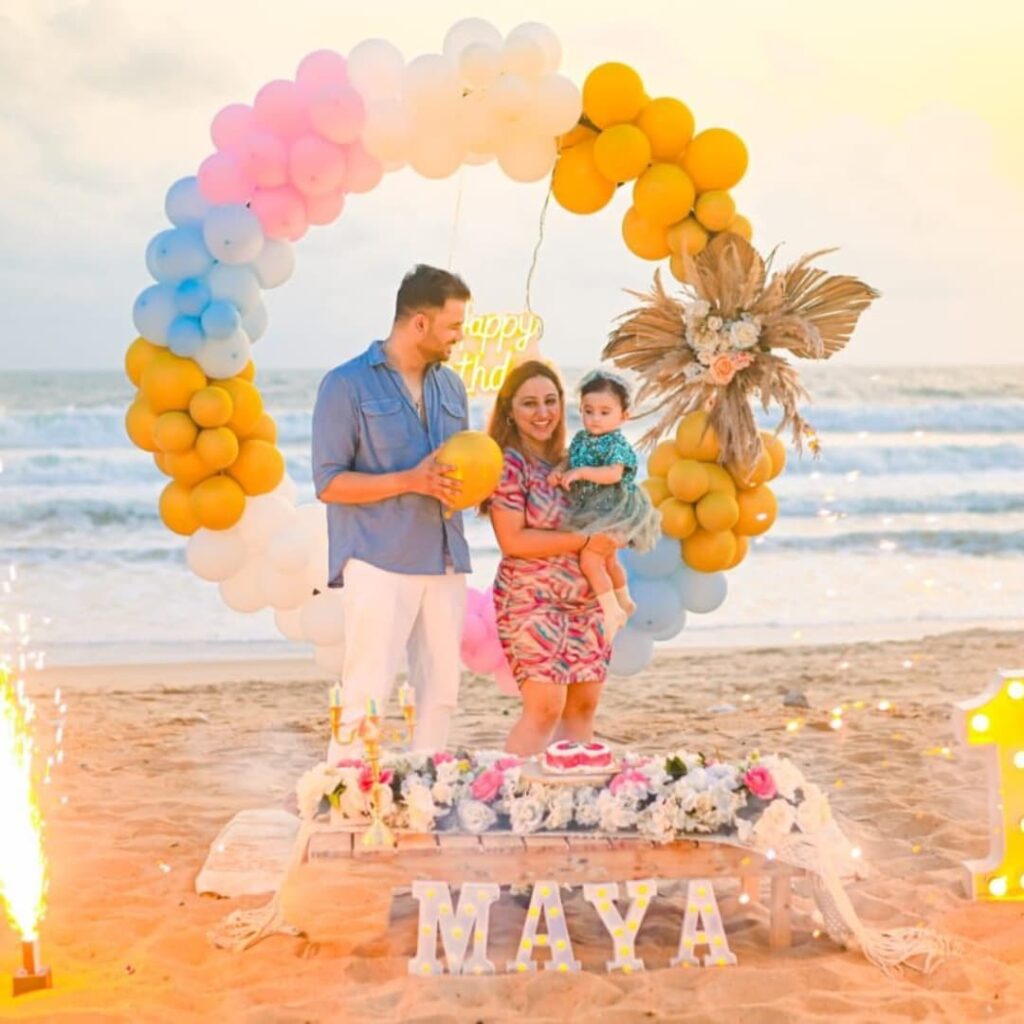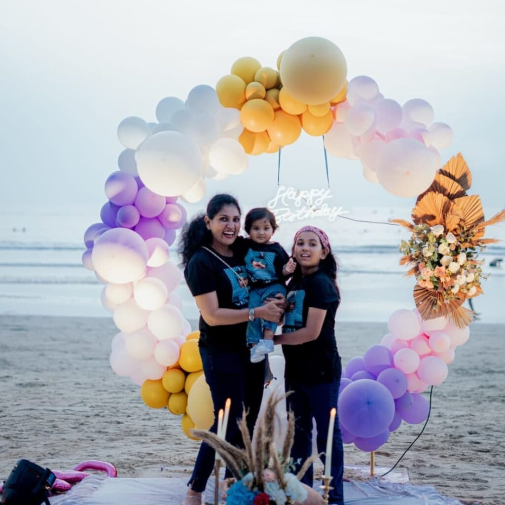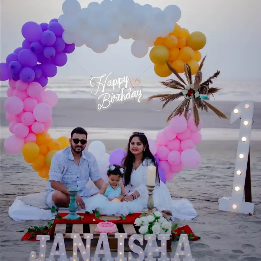 The golden sunset brings a soft glow that lights up every detail beautifully. The balloon arch, gentle waves, and the family’s joyful expressions blend into one perfect scene.