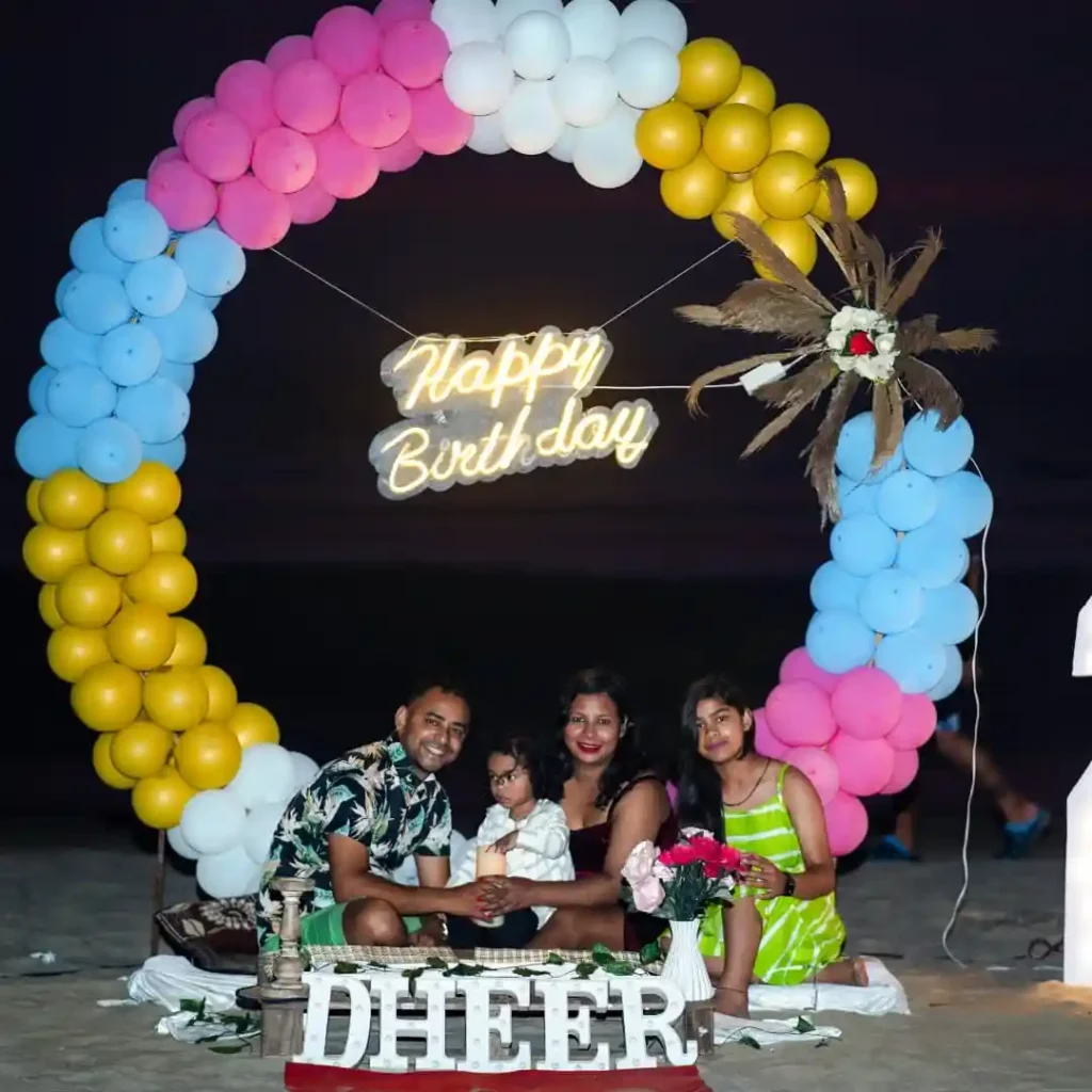 As night falls, the beach turns magical with lights and laughter. The balloon arch glows softly, and the family gathered around it looks completely at ease.