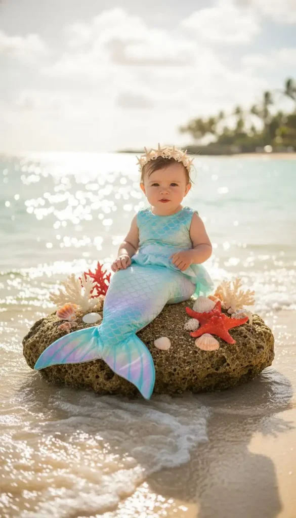 If you want something whimsical, go for a mini mermaid or surfer setup. A seashell crown or a tiny surfboard prop can make the shoot fun and memorable.