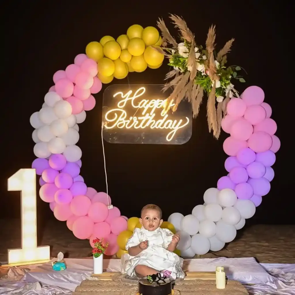 This setup stands out for its creative balloon arch and warm evening light. The design brings an instant birthday feel without being too formal.