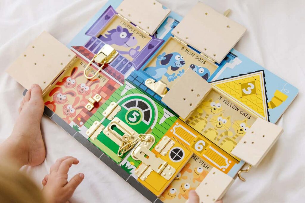 Babies and toddlers enjoy experimenting with each latch as they twist, slide, and hook their way through the board. This sensory toy is not only fun but also helps build fine motor skills, patience, and problem-solving abilities.