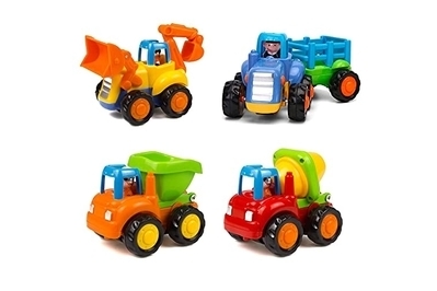 The Yiosion Push and Go Friction Powered Vehicles set includes four colorful trucks: a tractor-trailer, dump truck, concrete mixer, and backhoe. Each one is lightweight, easy to grip, and full of interactive details like movable parts and bright colors that catch the eye.