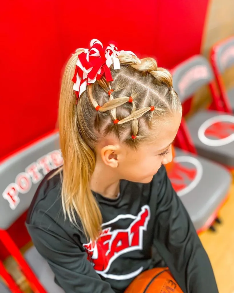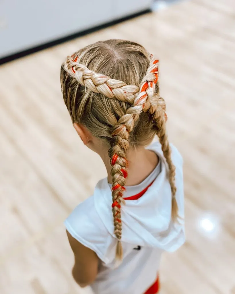 Those adorable orange elastics woven through blonde braids give total team spirit vibes. Creating this look is simple. Part your hair in zigzag sections, secure with matching elastics, and braid all the way down.