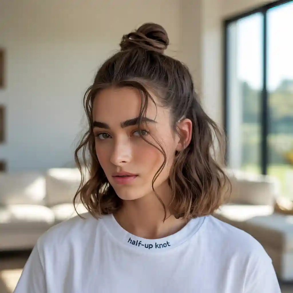 Keep the top neat while letting the rest flow freely. Pull the top half of your hair and tie it into a small knot. It keeps hair out of your eyes and face while still looking stylish and functional for walks, errands, or fitness classes.