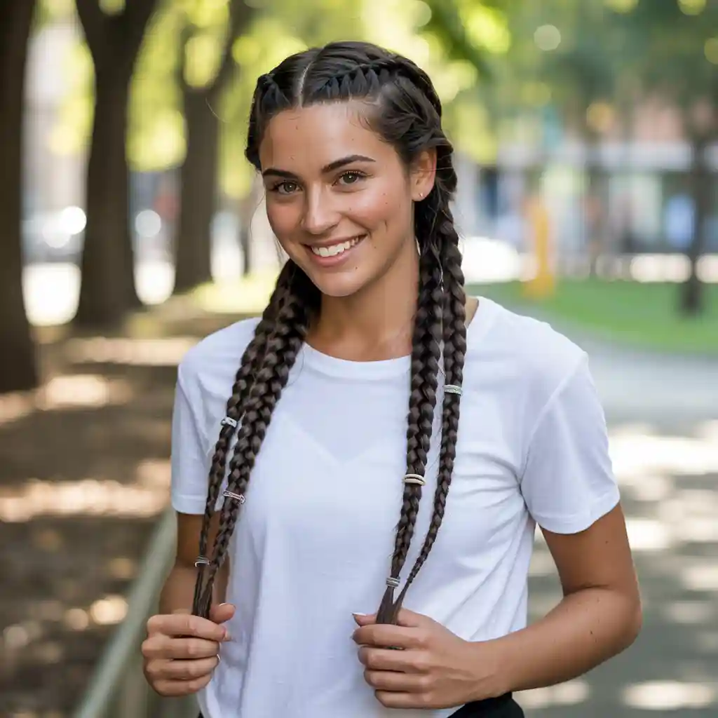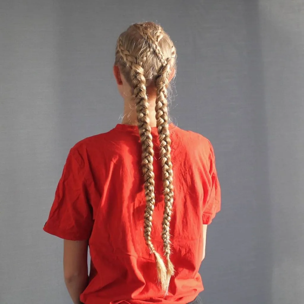 These twin French braids give strong athlete vibes with their neat and practical design. The technique is simple. Create a clean middle part and French braid each side, keeping the tension even for a smooth finish.