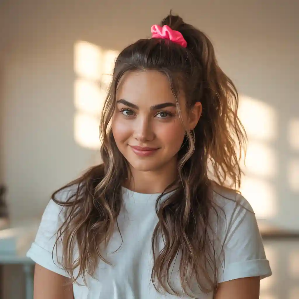 Retro meets practical. Pull the top half of your hair up and secure it with a soft scrunchie. It keeps volume while managing flyaways and gives a soft hold that is perfect for low-impact workouts.
