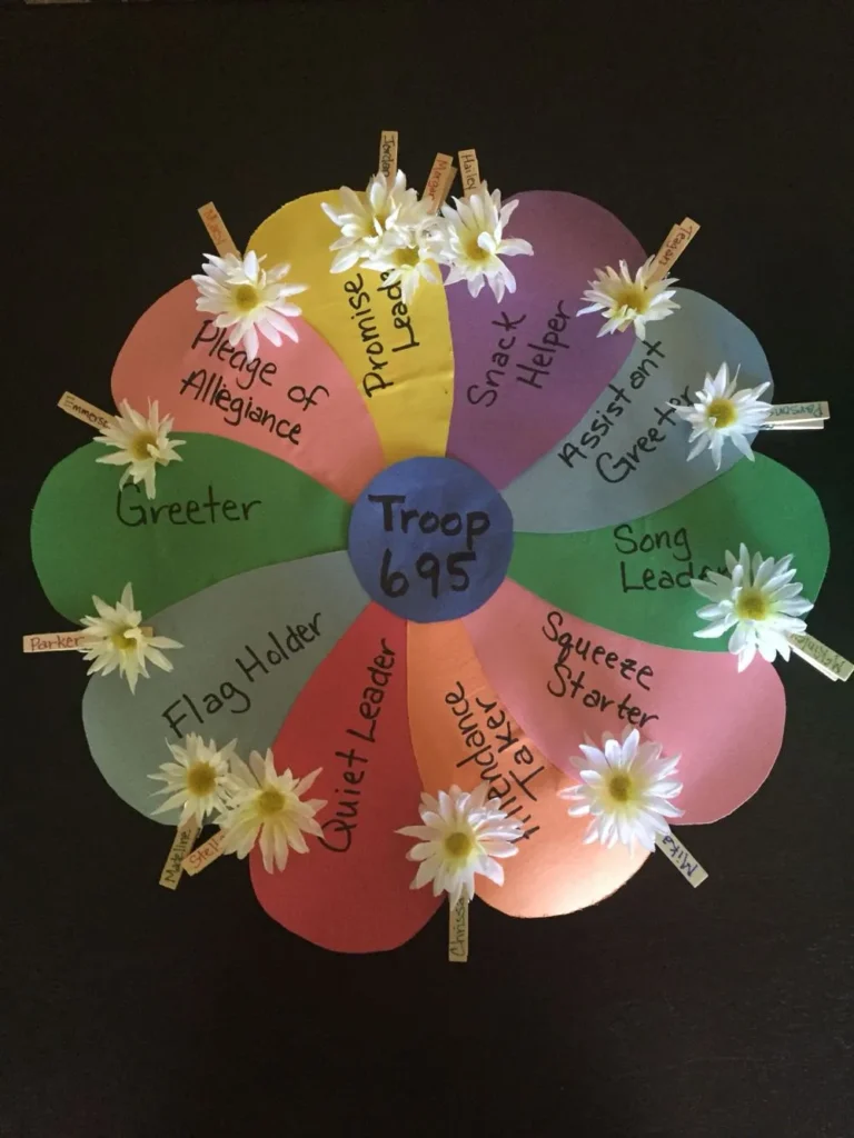 This beautiful flower chart helps organize troop roles in a cheerful and visual way. Each petal represents a different responsibility, like flag holder, snack helper, or song leader. It’s a simple craft that builds leadership, teamwork, and a sense of belonging within the group.