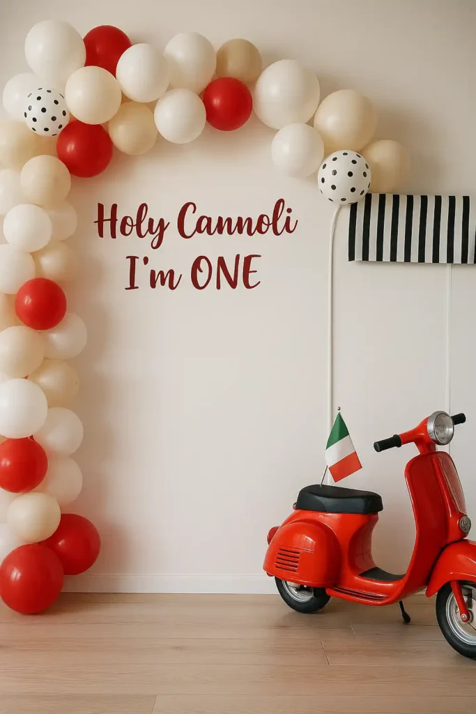 I wanted the decor to feel bright, happy, and full of life, just like a real Italian celebration. The main backdrop said “Holy Cannoli, I’m ONE” in bold red letters, surrounded by a mix of red, white, and cream balloons. It looked so cheerful against the white wall and made the perfect spot for photos.