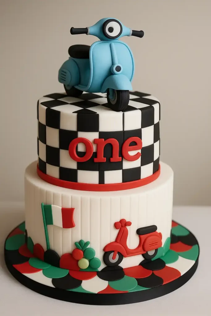 The cake was the centerpiece of the whole celebration and honestly one of my favorite details. I wanted something playful that matched our Italian theme but still looked sweet and simple. When I saw the design idea for a checkered cake with a little Vespa on top, I knew it was perfect.