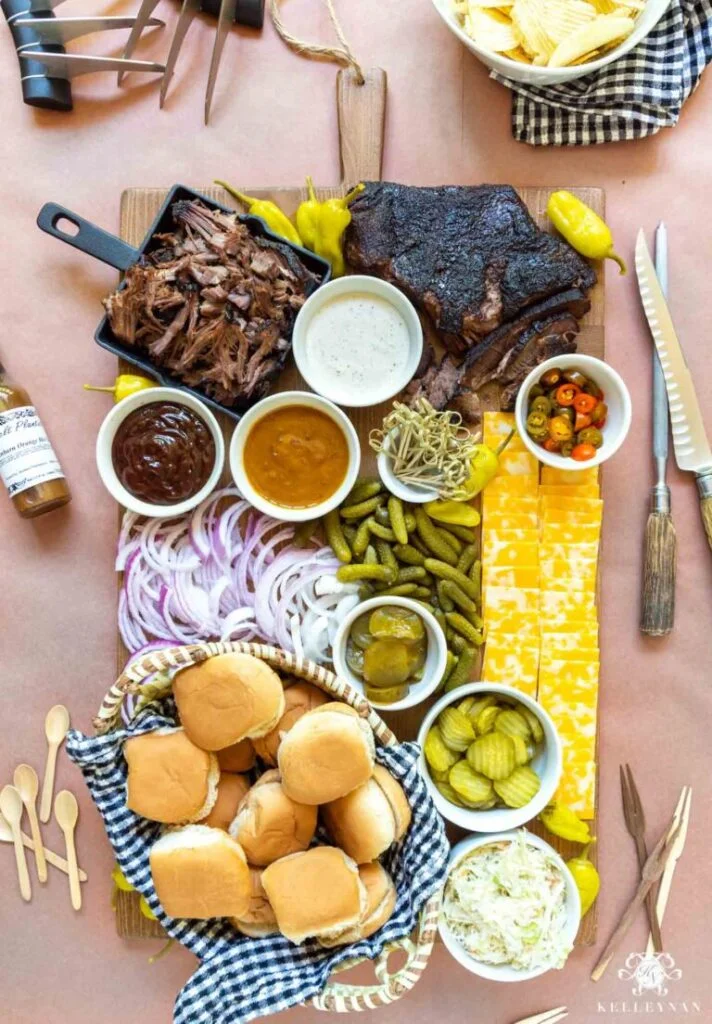 Fire up the grill and celebrate dad with a hearty Father’s Day BBQ charcuterie board. Add slices of smoked brisket, grilled sausages, ribs, and corn on the cob. Use small baskets or square skillets to serve food for a real backyard barbecue vibe. It’s a fun way to dine like a king and make dad feel extra special.