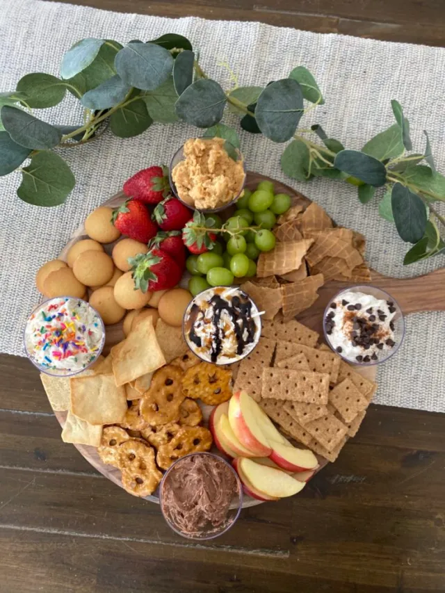 End the day on a sweet note with a dessert charcuterie board filled with treats kids love to dip and munch. Add fresh fruit, crackers, cookies, and a few small bowls of dips like peanut butter or chocolate sauce. It’s a delightful balance of fun and flavor for little dessert lovers.