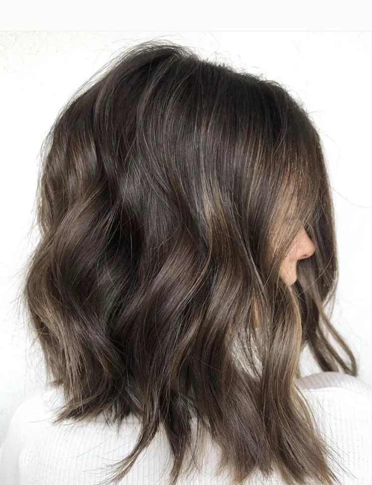 This hairstyle has longer than bob-length hair with side-swept bangs that frame the face and bring a touch of drama while still feeling soft and wearable.