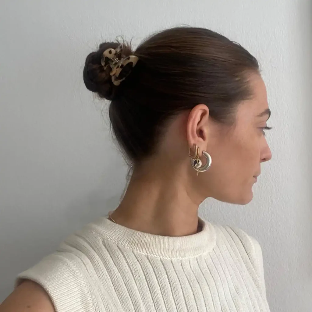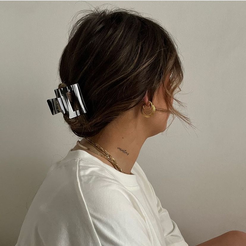If you thought buns were only for long hair, think again. A low claw clip bun can easily be done with short hair. Gather your strands at the nape of your neck, twist them inward, and clip them with a medium claw clip.