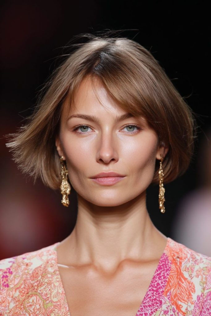 This side-swept short bob is both soft and sophisticated. The long, wispy bangs frame the face perfectly without feeling too heavy. It strikes the right balance between polished and effortless.