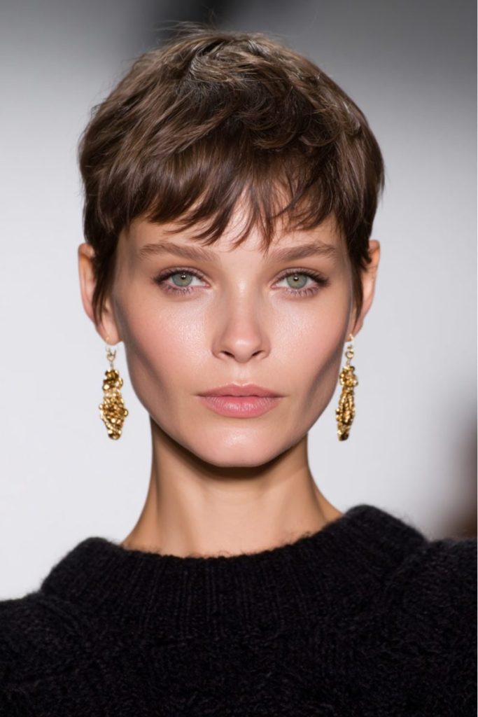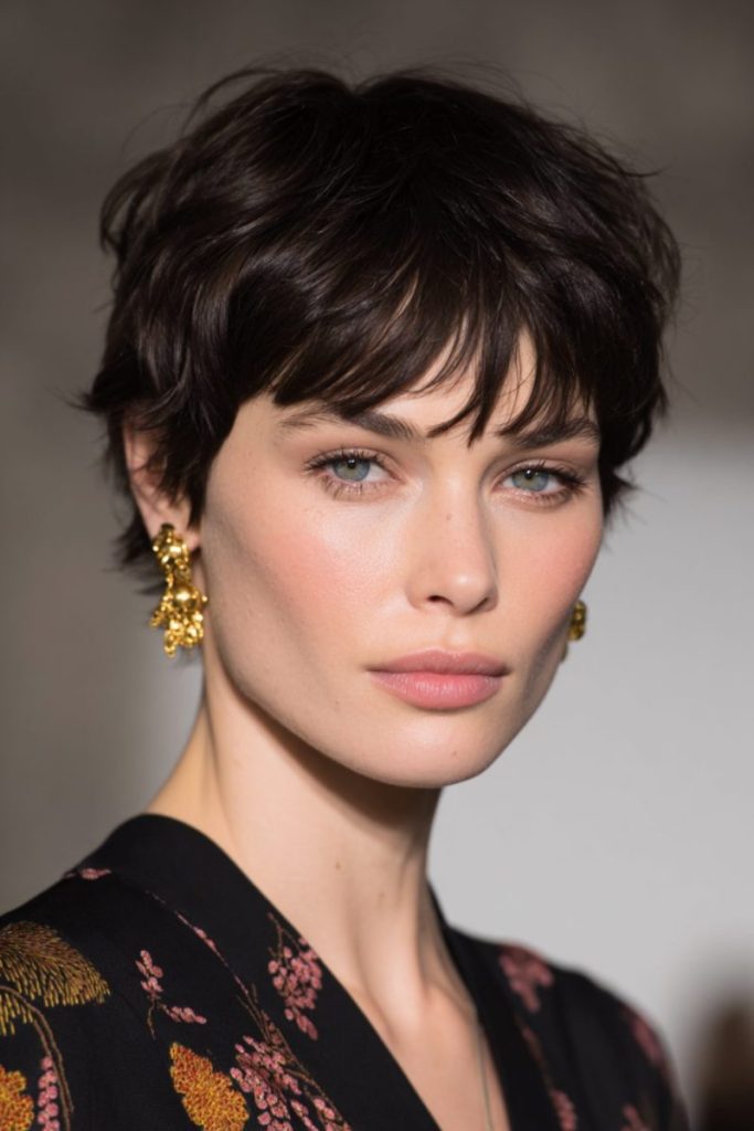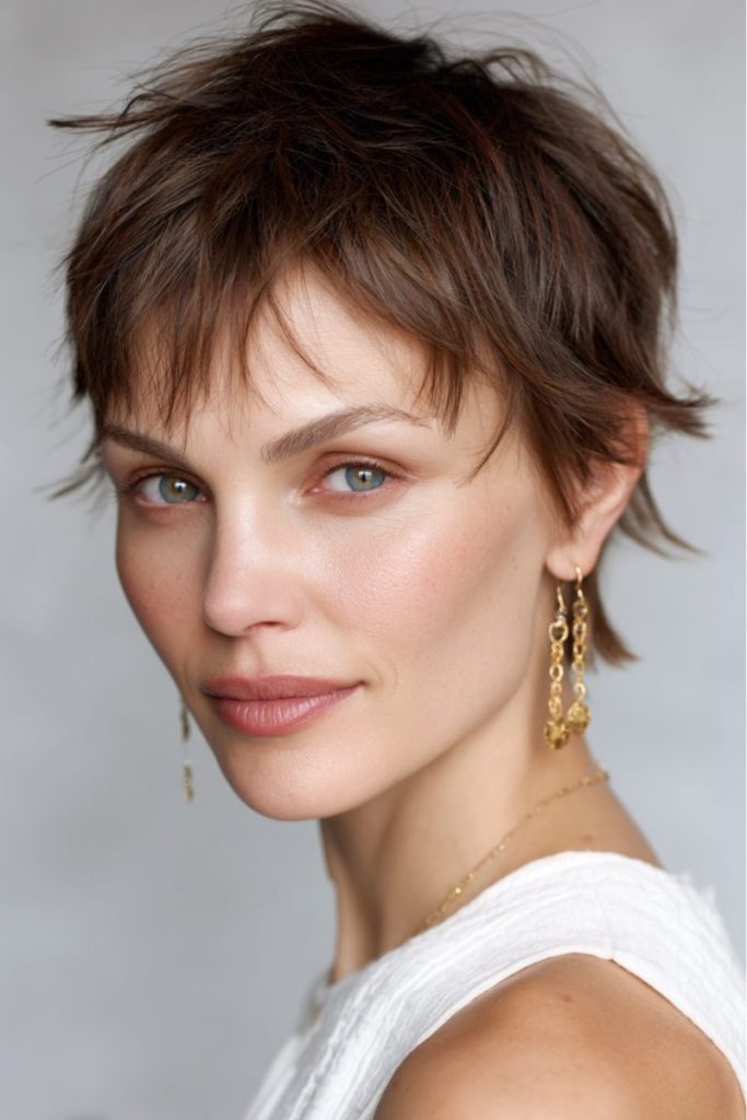 This tousled pixie with wispy bangs has an effortlessly cool vibe. It’s relaxed yet stylish, giving you that “ready in minutes” kind of confidence. The layers add natural texture and volume, making it easy to style on busy mornings.