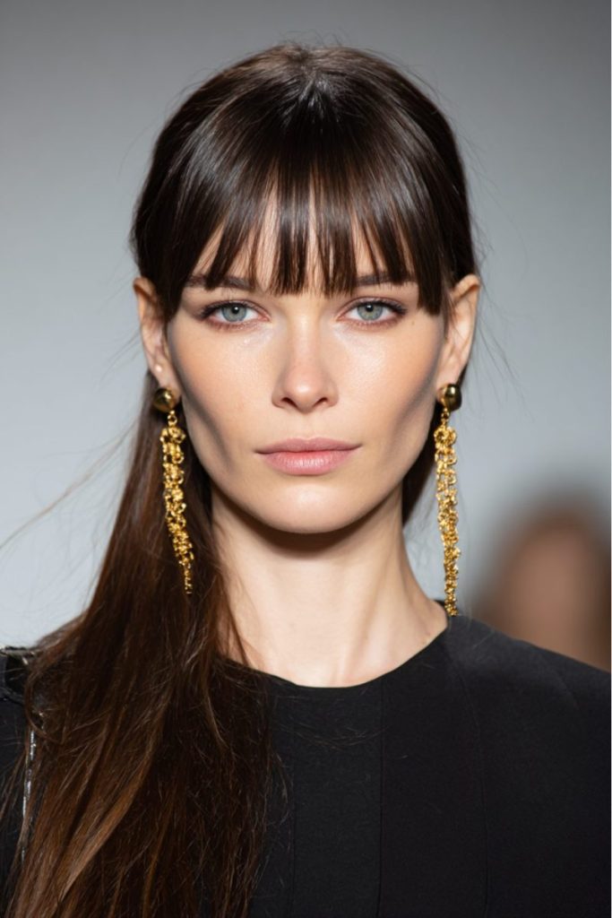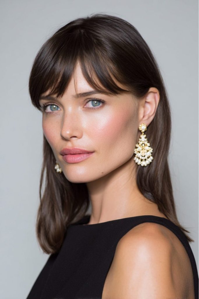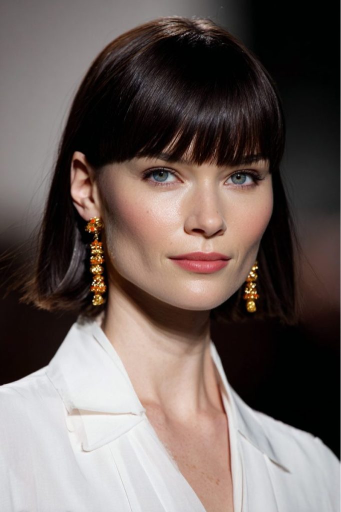 This look is all about clean, sharp sophistication. The sleek, straight hair pairs beautifully with bold blunt bangs, creating a polished and modern feel.